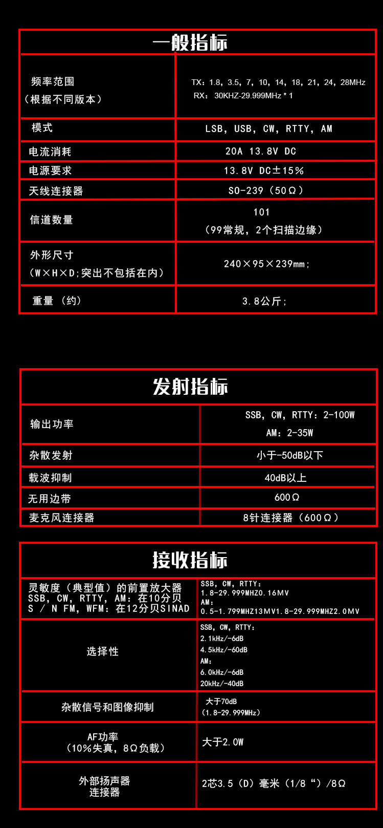 100W發(fā)射功率,大調(diào)諧旋鈕頻率調(diào)諧旋鈕手感好,可以快速選擇頻率,在不用時可以鎖定不用。加厚鋁板,比普通的車載臺加厚1倍,屏蔽效果好,抗干擾,散熱性能提升。