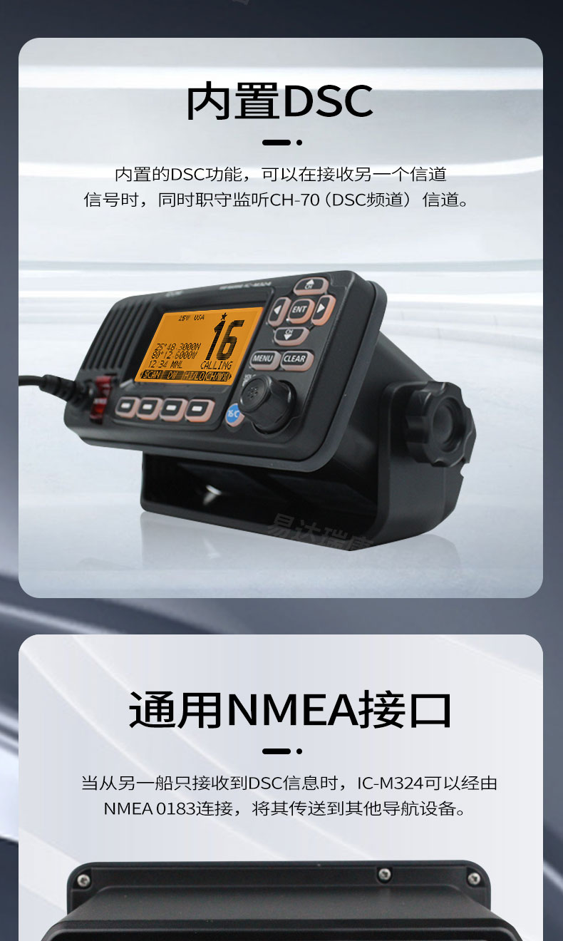 內置的DSC功能,即使您正在接收另一個頻道,DSC功能也可監聽ch70dsc頻道)信道,dsc功能包括  遇險 個人  小組  所有船舶  緊急性 安全性  位置請求/報告  輪詢請求和dsc測試調用。