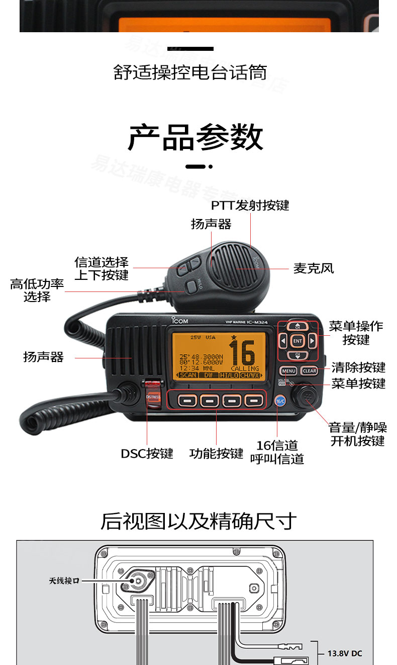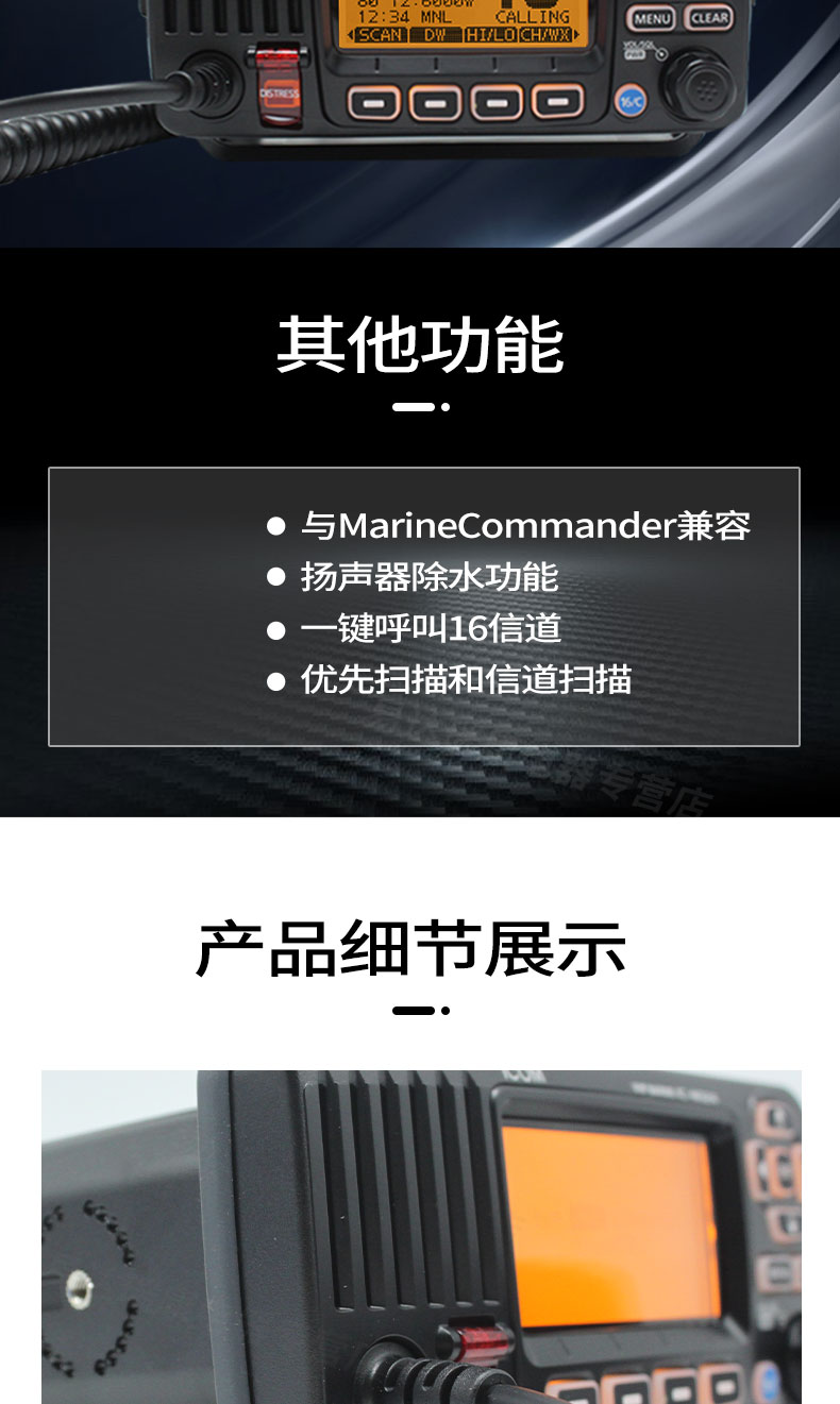 海事甚高頻電臺,內置通用海事頻點。DSC功能,在遇險是及時發出緊急求救信號。一鍵16信道緊急呼叫。CMIIT 核準證代碼CMIIT ID: 2016FJ1269
