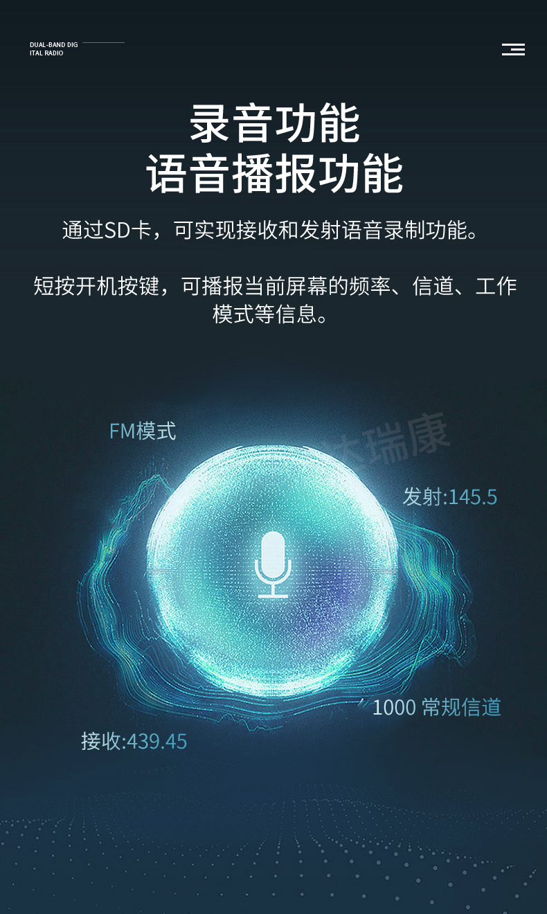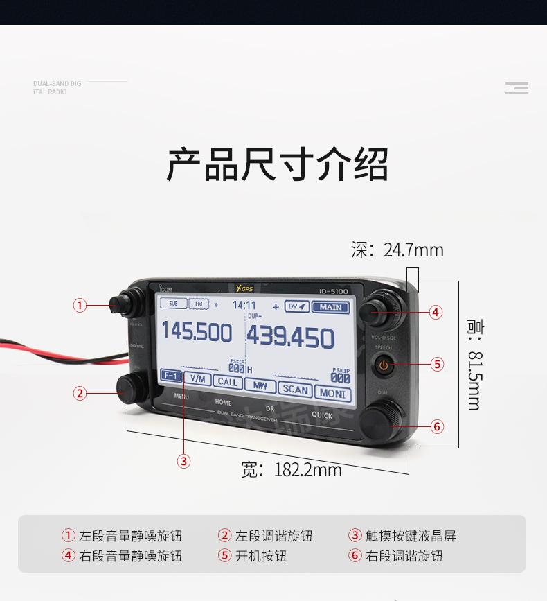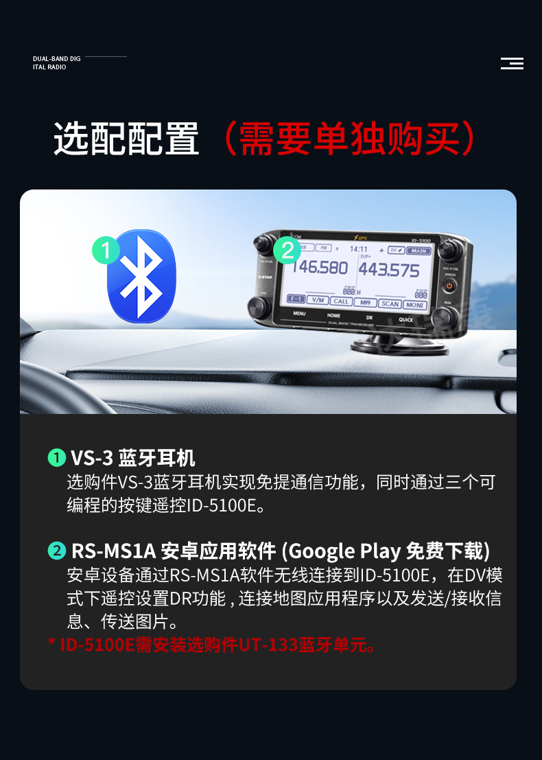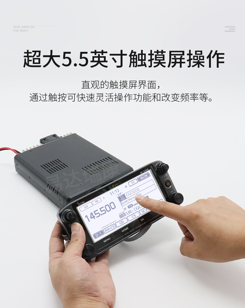 數(shù)模業(yè)余雙段車臺(tái) 5.5英寸觸摸屏操作,可同時(shí)接收FM/FM 、FM/DV 、DV/DV模式兩個(gè)頻道,雙段雙顯雙守候,內(nèi)置GPS接收機(jī),DV/FM中繼臺(tái)列表功能,語音和數(shù)據(jù)存SD卡槽,可選配藍(lán)牙耳機(jī),50W大功率輸出 業(yè)余愛好者常用款 核準(zhǔn)代碼CMIIT ID: 2015FJ0386