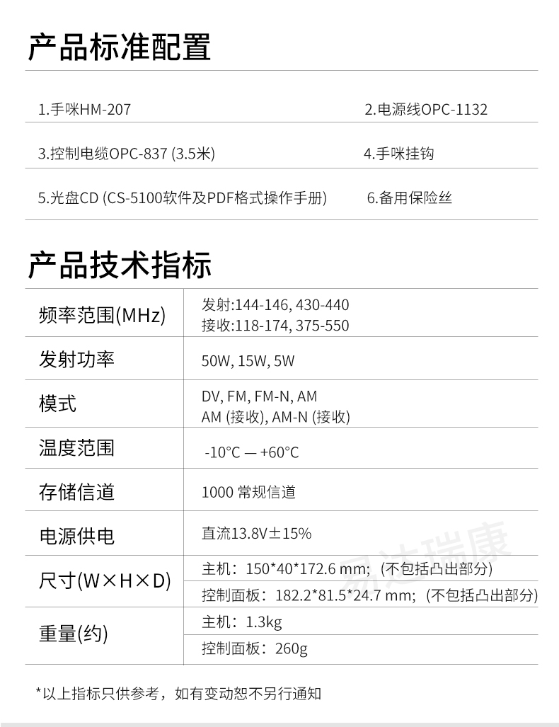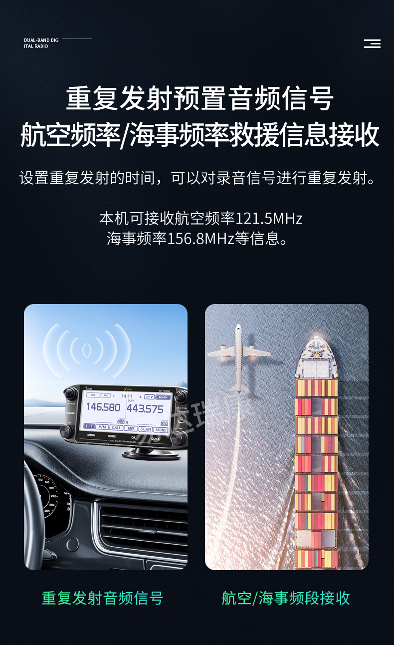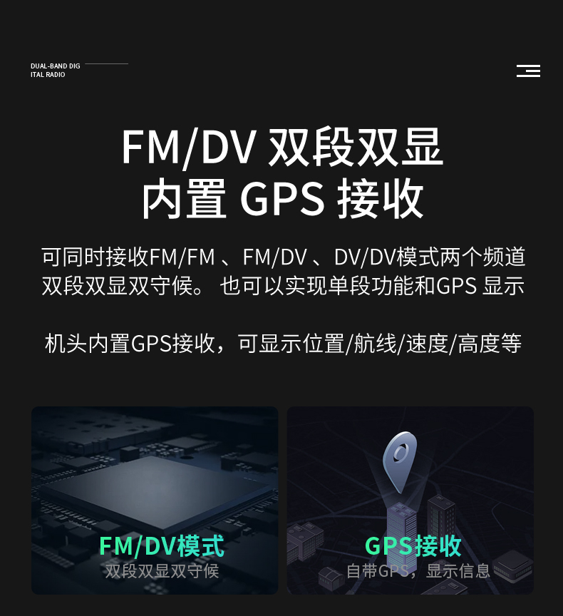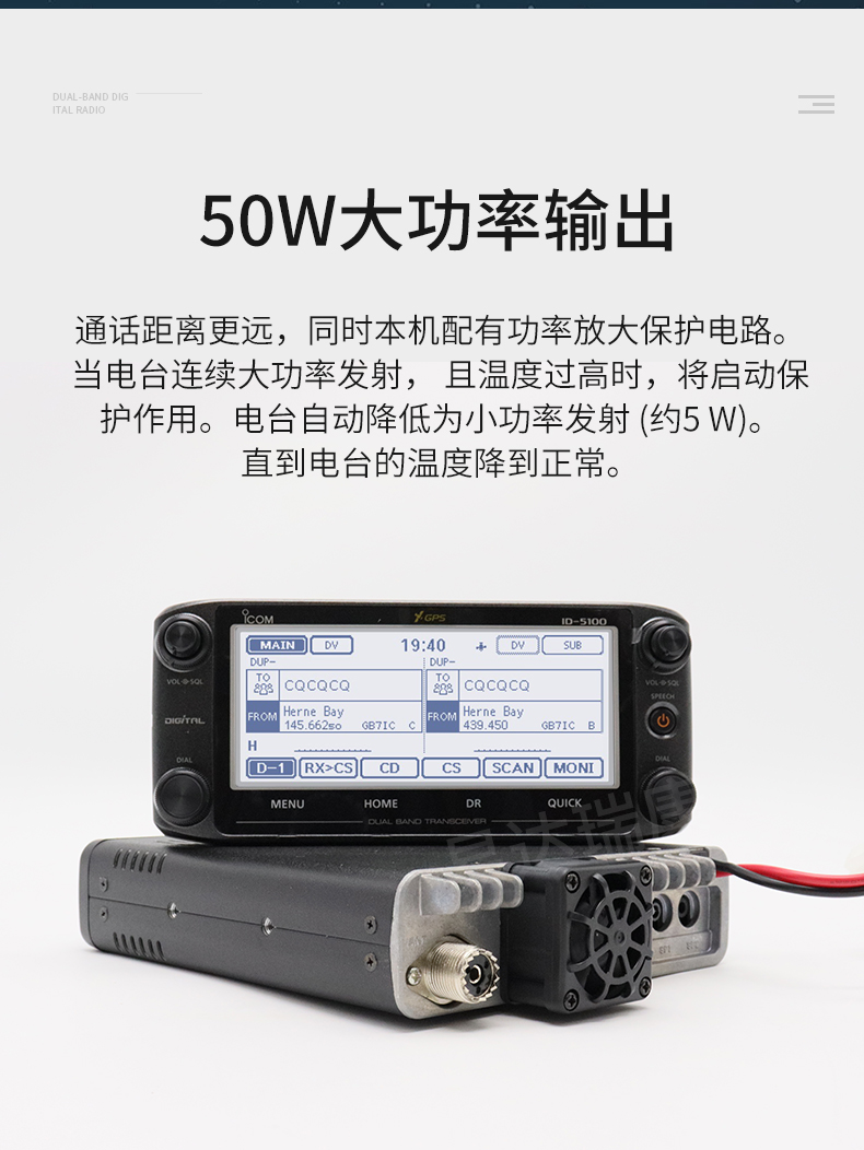• 144MHz/430MHz雙段雙顯雙待,觸摸屏幕,50W大功率,內(nèi)置GPS。