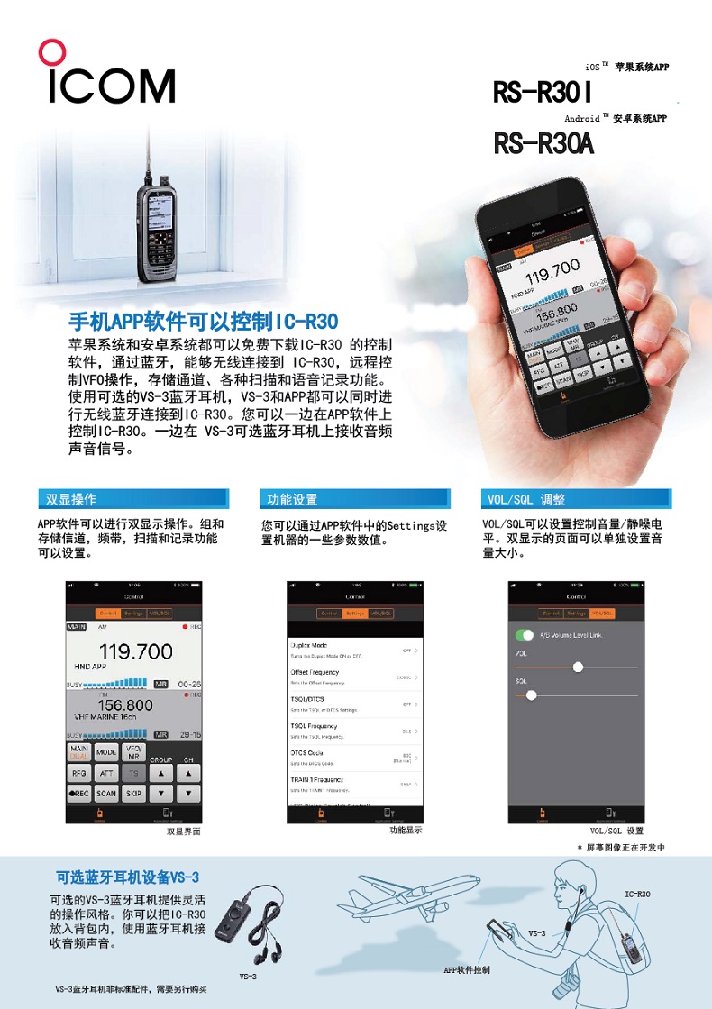 蘋果系統和安卓系統都可以免費下載IC-R30的控制軟件,通過藍牙,能夠無線連接到IC-R30,遠程控制VFO操作,存儲通道 各種掃描和語音記錄功能。使用可選的VS-3藍牙耳機,VS-3APP都可以同時進行無線藍牙連接到IC-R30.您可以一邊在APP上控制IC-R30.一邊在VS-3可選藍牙耳機上接收音頻聲音信號。