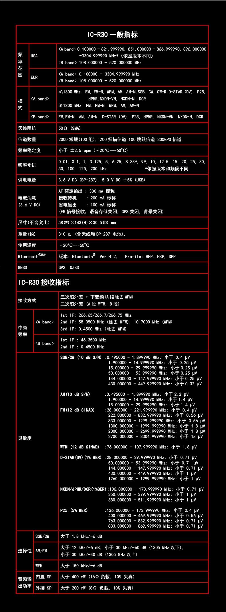 IC-R30解碼各種數字協議型號,包括P25(Phase1),NXDN  DPMR  D-STAR(Digital  Smart Technology for Amateur Radio)和日本國內DCRDigital Convenience Radio.