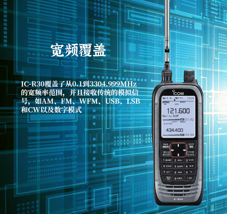 IC-R30覆蓋了從0.13304.999MHz的款頻率范圍,并且接收系統的模擬信道,如AM FM WFM USB LSB CW以及數字模式.