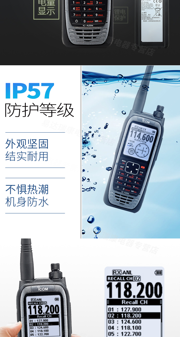 IC-A25N內(nèi)置GPS和藍(lán)牙,VOR導(dǎo)航功能可以幫助您修正航線,以免出現(xiàn)偏差。 IC-A25N/A25C航空對講機(jī)有2.3英寸液晶顯示屏,智能電量顯示可實(shí)時檢測電池狀態(tài),IP57防護(hù)等級防止灰塵進(jìn)入,1米水下放置30分鐘核準(zhǔn)代碼:CMIIT ID:2018HJ0692