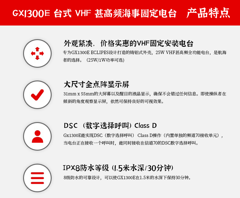 外觀緊湊,價格實惠的VHF固定安裝電臺 大尺寸全點陣顯示屏 DSC(數(shù)字選擇呼叫)緊急狀態(tài)使用,Class D IPX8防水等級(1.5米水深/30分鐘)