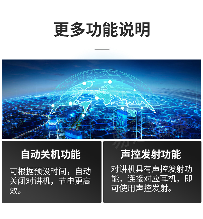 支持電腦調頻和手動調頻兩種方式。聲控發射功能,在配合聲控耳機使用時解放雙手。大功率喇叭,即使在吵雜的環境中也能清晰的聽見語音。