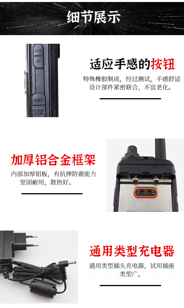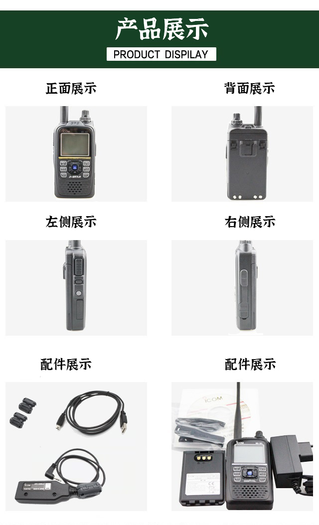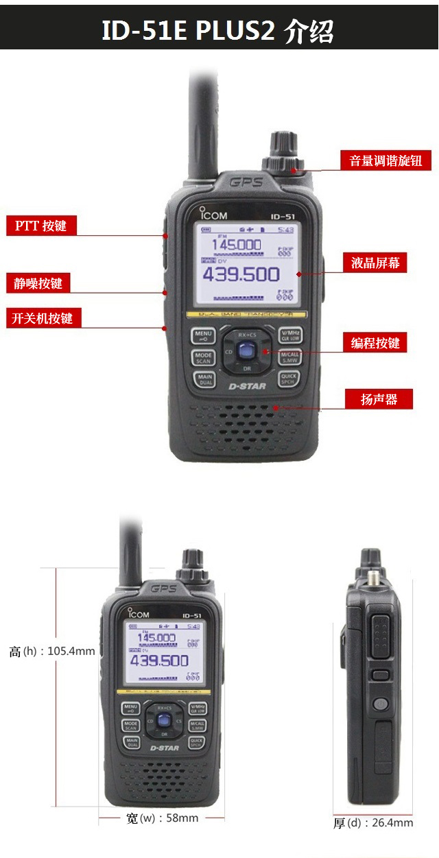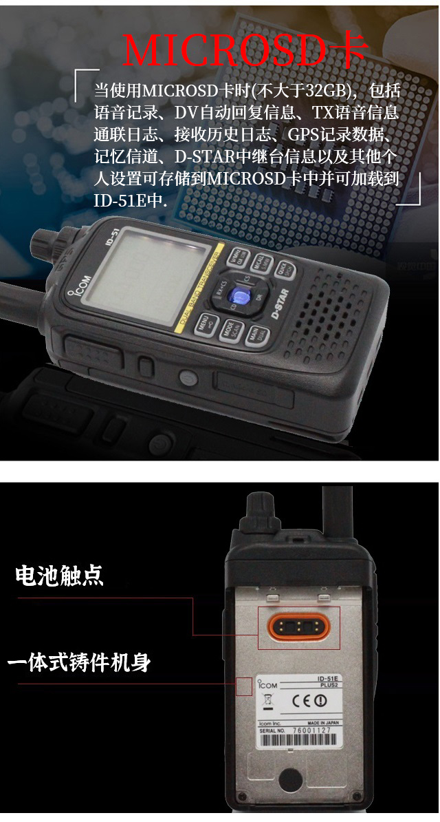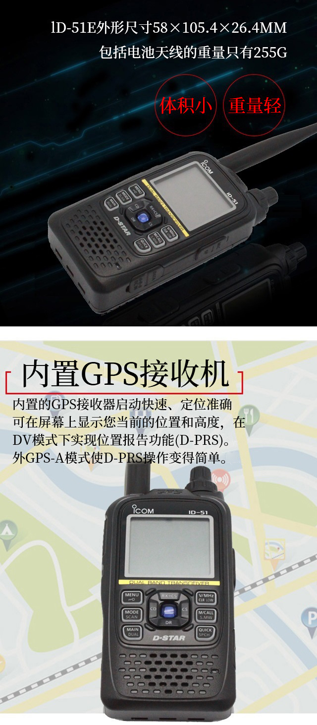144MHz/430MHz雙顯雙待,FM收音機功能,內置GPS,D-STAR DV模式可傳輸語音和數據,錄音功能(需配microSD卡)。IPX7防水設計,一米水深可放置半小時。