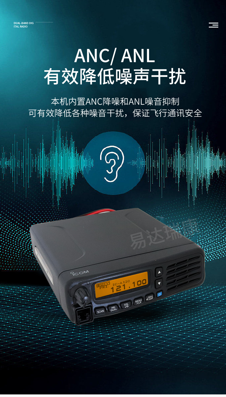 • ANC自動降噪,機場航空用車載臺,可選配藍牙耳機。